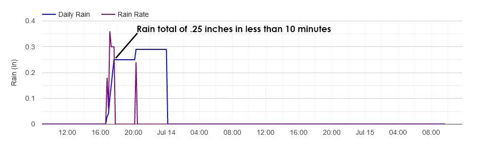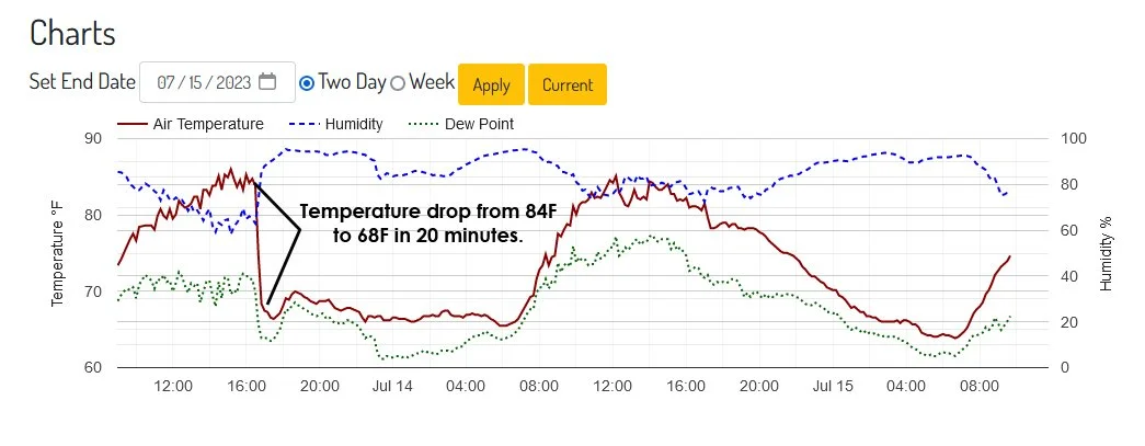 The top chart below shows a graph of temperature changes on the 13th, 14th, and 15th. A sharp drop in temperature is shown on the first graph when cooler air reached our weather station. The air was flowing out of a thunderstorm as rain cooled air descended to the ground. The cooling was aided by the evaporation of rain drops. Evaporation requires heat so they air cools as the heat evaporates the water. As the air mass aloft cools it becomes more dense and heavier. The heavier air descends, usually with gusty winds flowing out of the leading edge of the storm. Gravity wins! The cooler air mixes with warmer air which warms the cool air and cools the warm air. That is one example of how important water is the life on Earth. As it changes from water vapor to liquid water or snow and ice it regulates global temperatures. As the most important Greenhouse Gas, water vapor cools and warms the planet helping to keep temperatures within boundaries that keep life possible on Earth.
