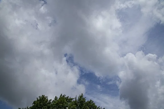 /The photos below were taken on July 13, 2023 during the late morning. The day started with clear skies but soon solar heating and a humid air destabilized the air mass. The Cumulus clouds show currents of rising air. The moist air condensed cloud droplets to form cumulus clouds which expanded upward throughout the afternoon. Finally a few thunderstorms developed. The photo on the left shows Cumulus cloud bases from almost directly below. The photo on the right shows Cumulus congestus clouds which evolved into thunderstorms.