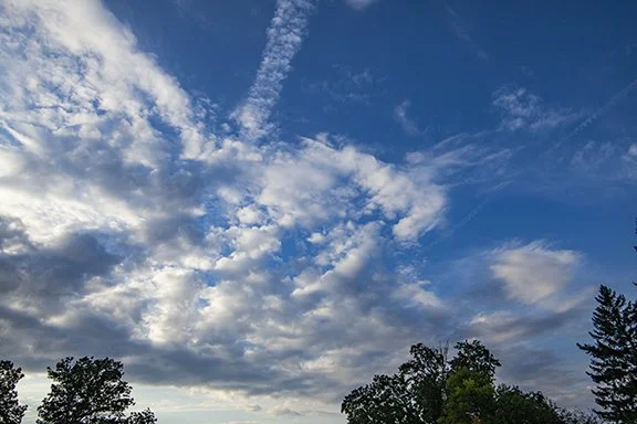 /After days of clear skies we finally had clouds from the Cirrus family move overhead from the west. CONTRAILS get their name from Condensation Trails - man-made clouds that form from the condensation of water vapor in jet engine exhaust. As long as there is sufficient moisture aloft naturally the addition of more moisture from the engine exhaust raises the relative humidity high enough to condense into a CONTRAIL. Several CONTRAILS are visible in the photo below and over time they either spread into a pattern seen here from the bottom left to the upper right of the photo or they may evaporate where the air is drier as is seen in the CONTRAIL visible in the center of the photo and near the bottom of the screen.